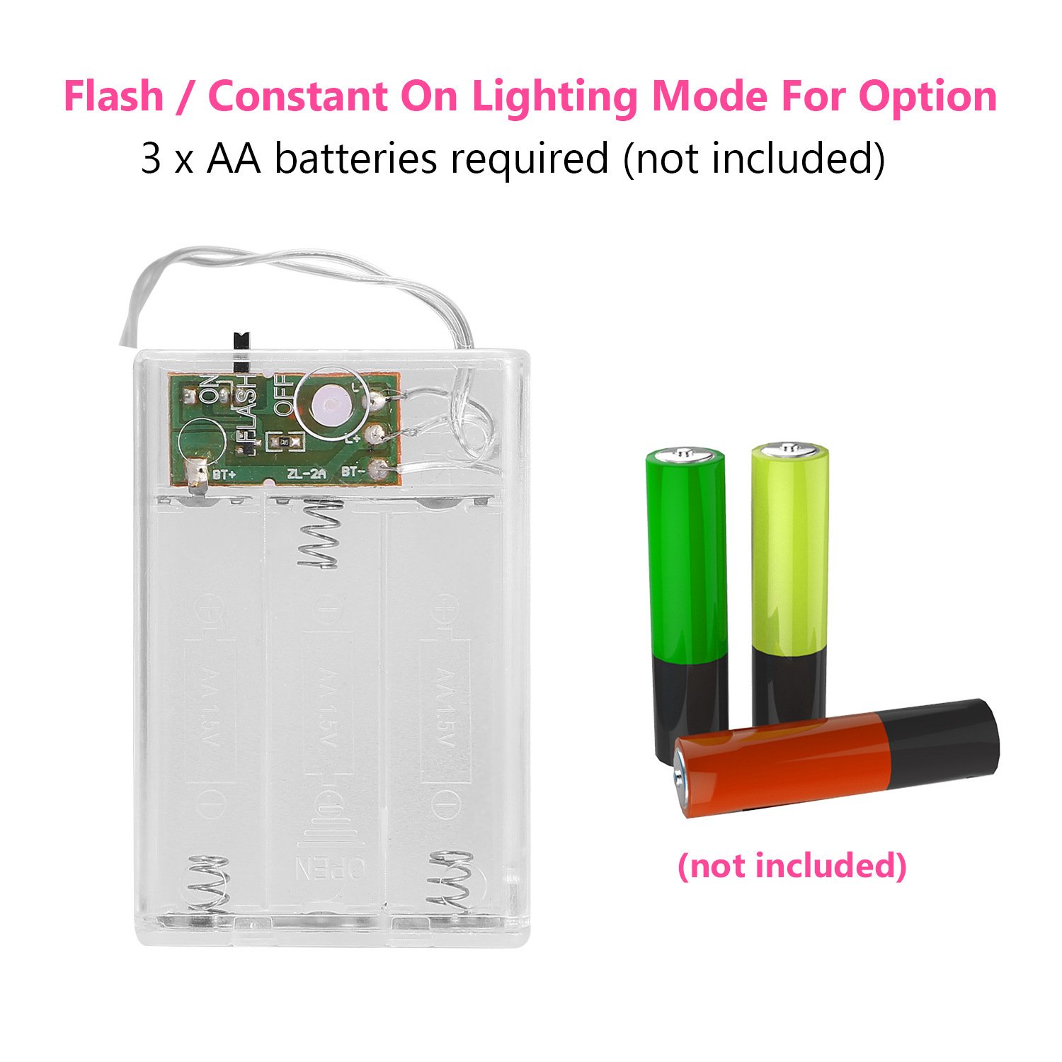 **BATTERY OPERATED & 2 LIGHTING MODES*:Powered by 3 x AA batteries(not included),which makes it safe and convenient to use almost anywhere. Designed with 2 lighting modes(flash/constant on) for switch,just choose any one to display as you need.